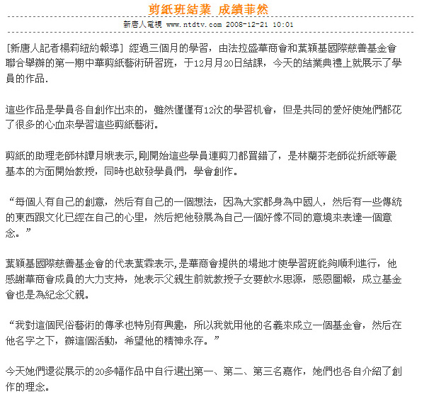 趙蘭芬女士應法拉盛華商會和葉穎基國際慈善基金會的邀請, 教授中華剪紙藝術研習班.